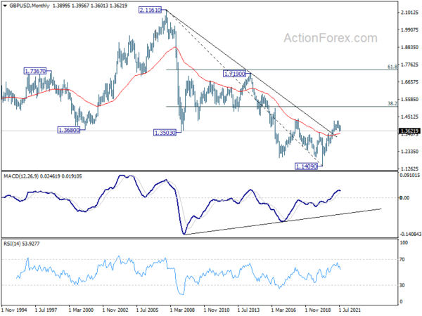 In the bigger picture, current development argues that rise from 1.1409 (2020 low) has completed at 1.4248, after failing 1.4376 resistance. Fall from there could either be correcting the rise form 1.1409, or starting another falling leg inside long term sideway pattern. In either case, sustained break of 1.3482 resistance turned support will target 38.2% retracement of 1.1409 to 1.4248 at 1.3164 first. Break there will pave the way to 61.8% retracement at 1.2493.