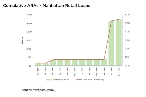This chart shows appraisal reduction amounts (ARAs) on Manhattan retail properties tracked by the report rose to about $260 million since October.