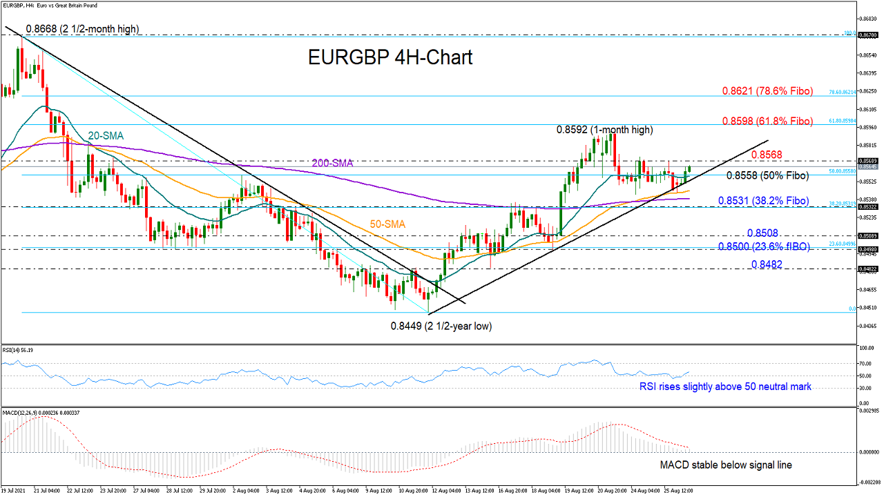 EURGBP refused to close below the 50-period simple moving average (SMA) in the four-hour chart and the supportive trendline, raising optimism that the upward pattern could see further continuation even if the flattening SMAs are providing little hope for an uptrend improvement at the moment.