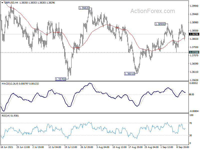 Intraday bias in GBP/USD remains neutral as it’s staying in range below 1.3890. On the upside, above 1.3890 will resume the rise from 1.3601 for 1.3982 resistance. Decisive break there will indicate that fall from 1.4248 has completed. On the downside, however, break of 1.3725 support will turn bias back to the downside for retesting 1.3570/3601 support zone instead.