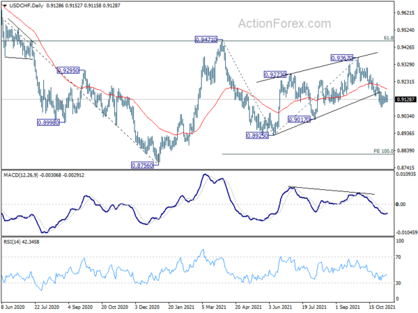 USD/CHF is staying in consolidation from 0.9084 and intraday bias remains neutral. Further decline is expected as long as 0.9174 resistance holds. Break of 0.9084 will resume the fall from 0.9367 to 0.9017 support, and then 0.8925. On the upside, however, break of 0.9174 resistance will indicate short term bottoming and turn bias back to the upside for stronger rebound instead.