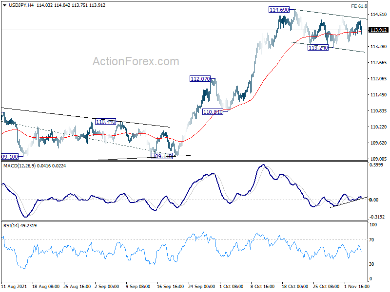 USD/JPY is still extending the consolidation from 114.69 and intraday bias remains neutral first. On the upside, firm break of 114.69 will resume the larger up trend to 100% projection of 102.58 to 111.65 from 109.11 at 118.18 next. Break of 113.24 will bring deeper pull back, but downside should be contained above 112.07 resistance turned support to bring rebound.